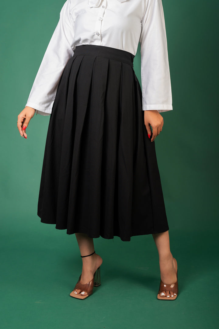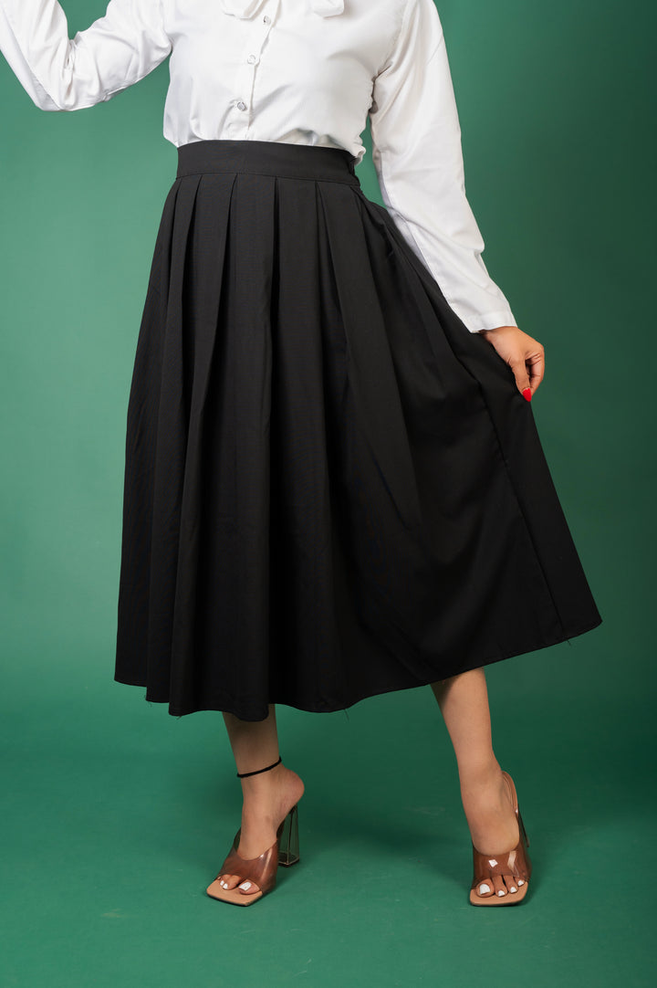 Modal is wearing a black box pleated midi skirt. the skirt has a high waistband with a button and zipper closure on the side, giving it a classic and elegant look. the pleats add structure and volume to the