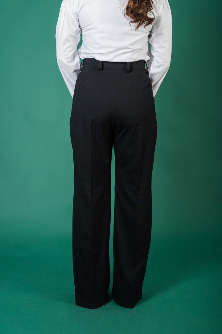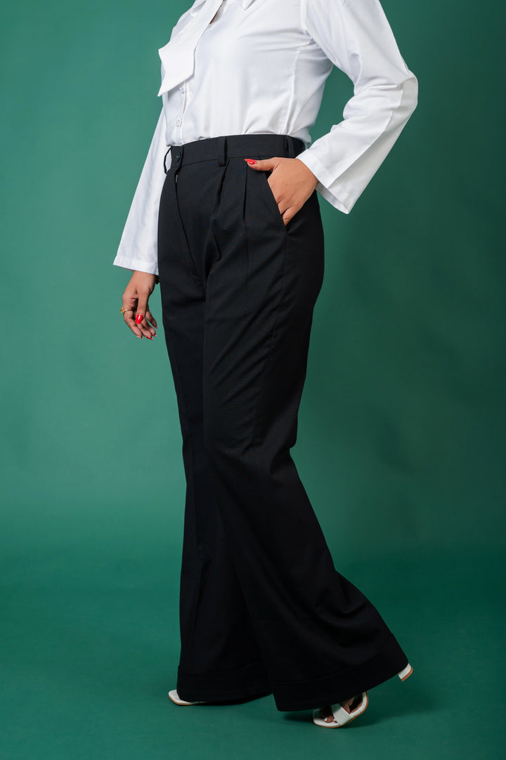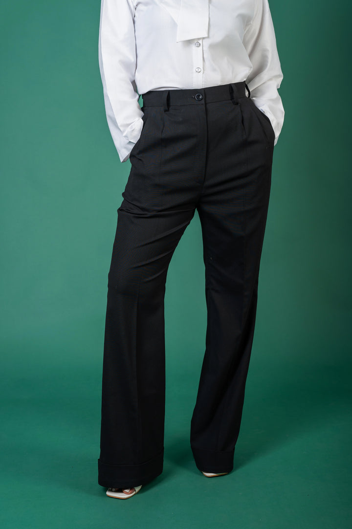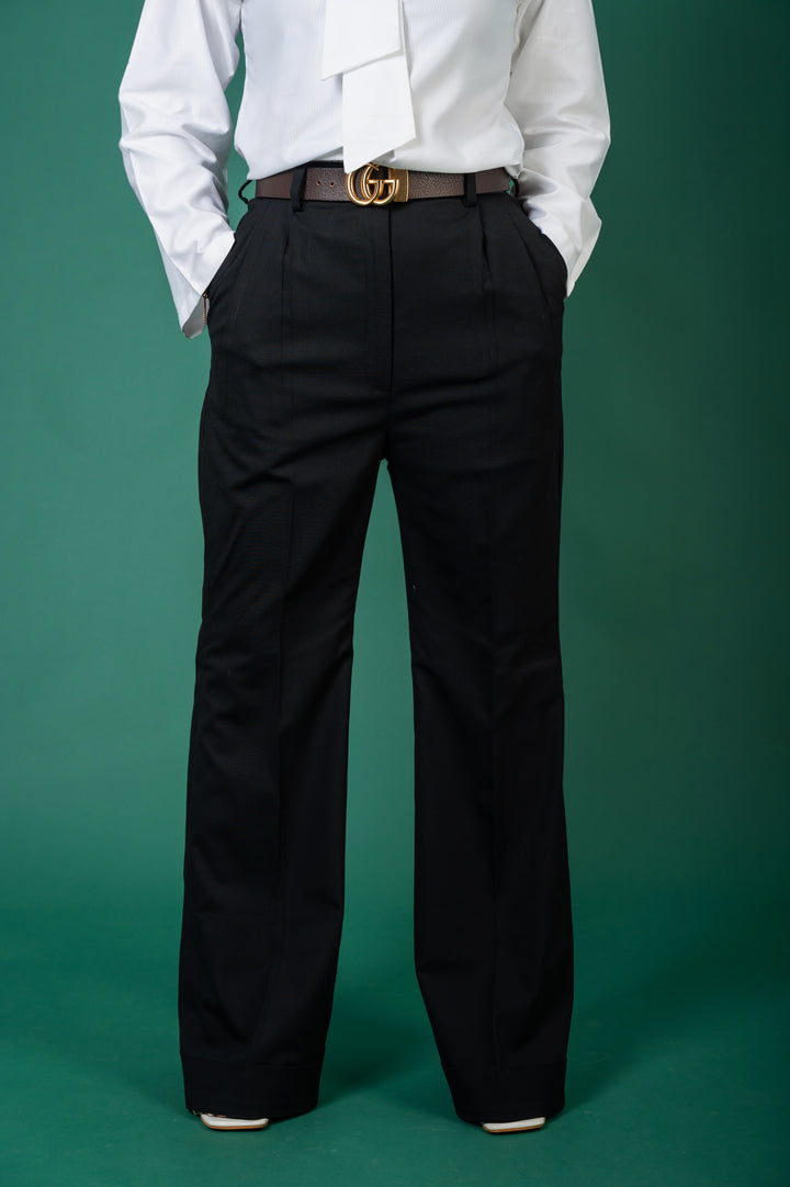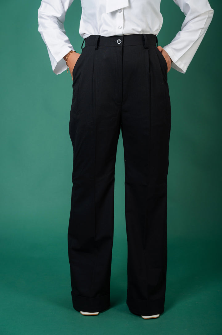 Elevate your wardrobe with these classic black high-waist trousers designed to bring a blend of elegance and comfort to any occasion. with a tailored fit. front pleats, and a straight-leg cut, these