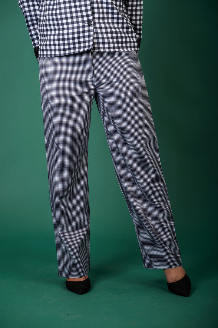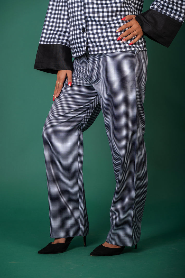 The pants in the image feature a black-and-white gingham check pattern. the design is minimal and classic, with straight-leg tailoring and a slightly