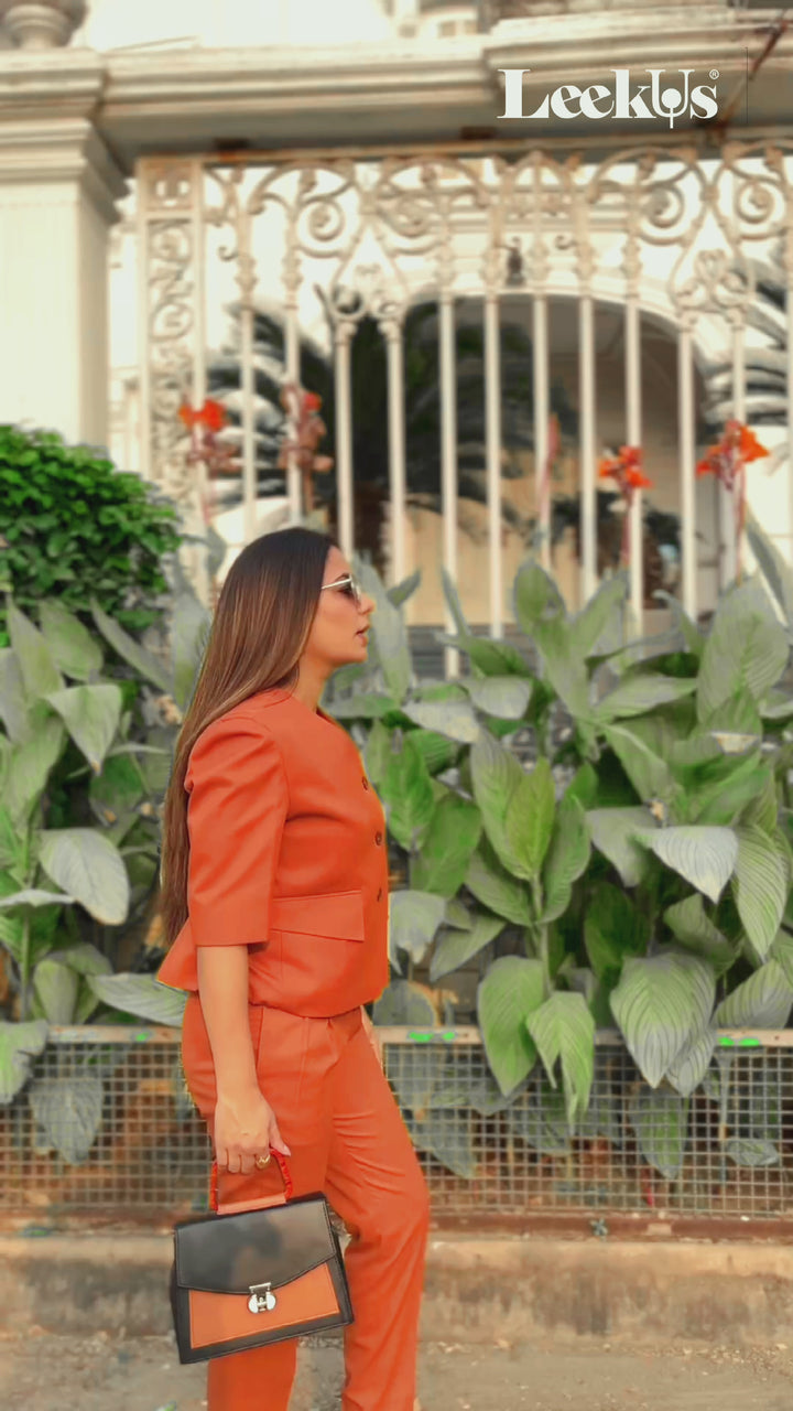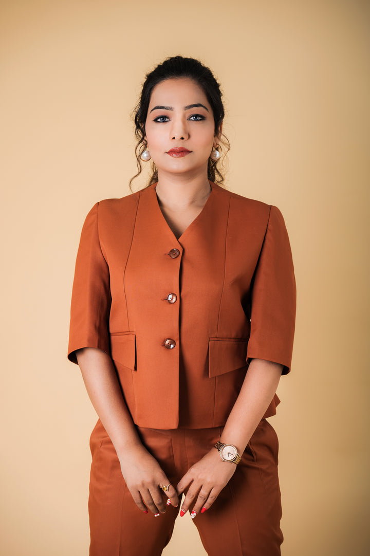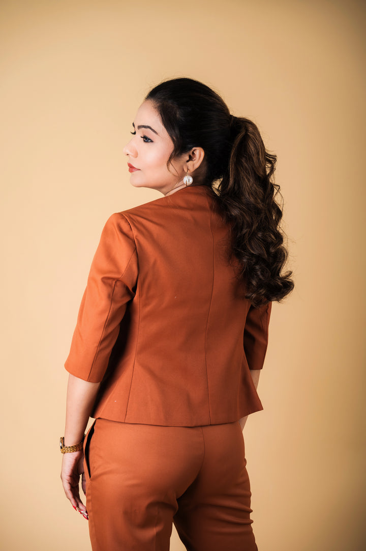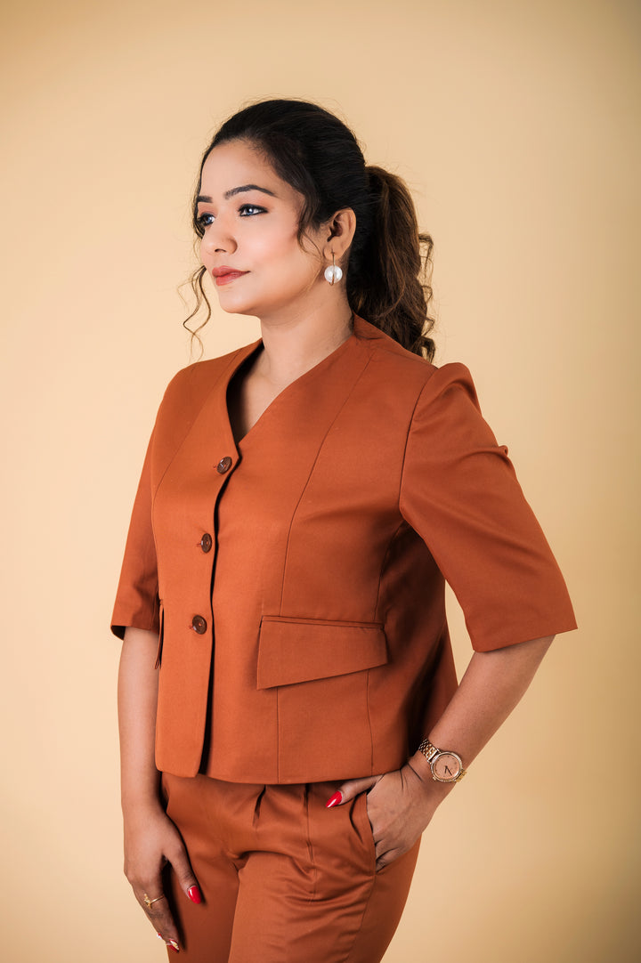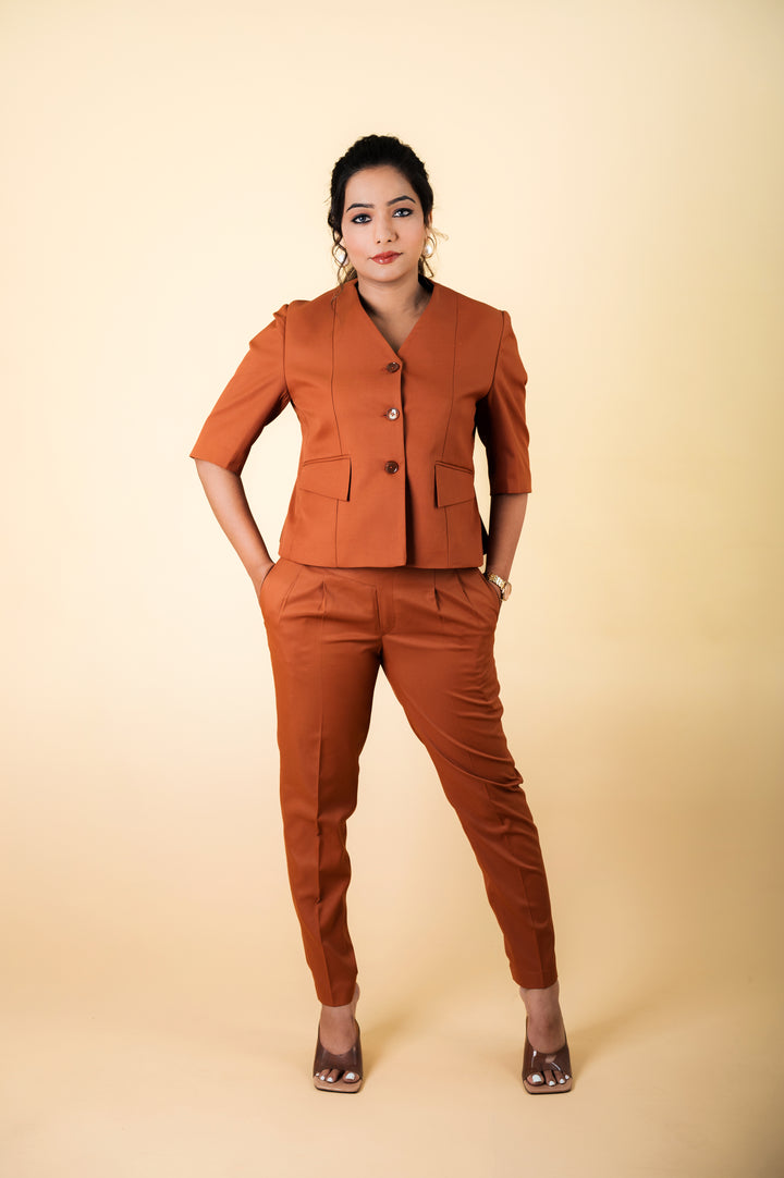 A tailored and minimalist outfit featuring a fitted blazer with a v-neckline, three-quarter sleeves, button closure, and functional flap pockets. paired with