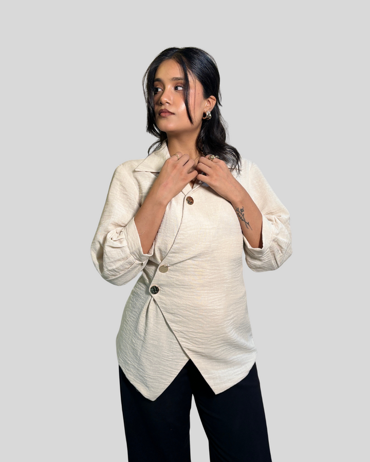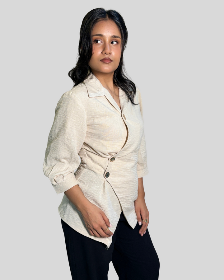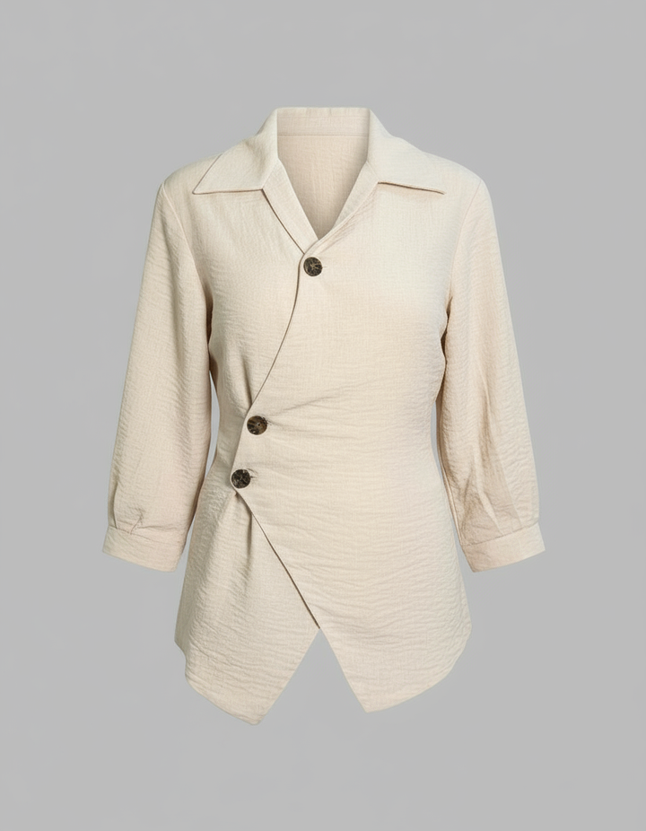 โ Asymmetric button-up with a diagonally wrapped front closure