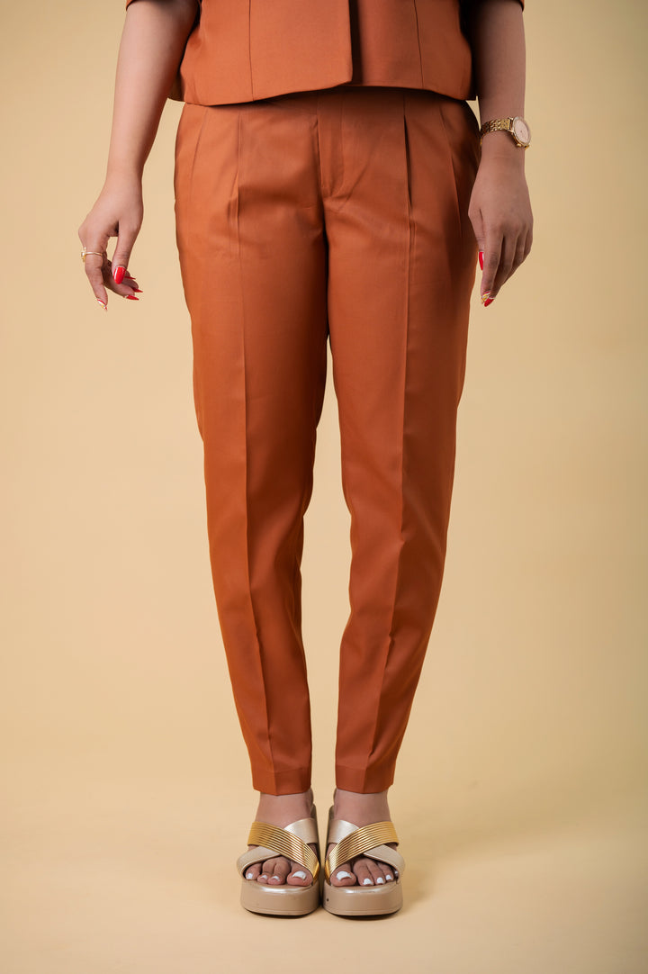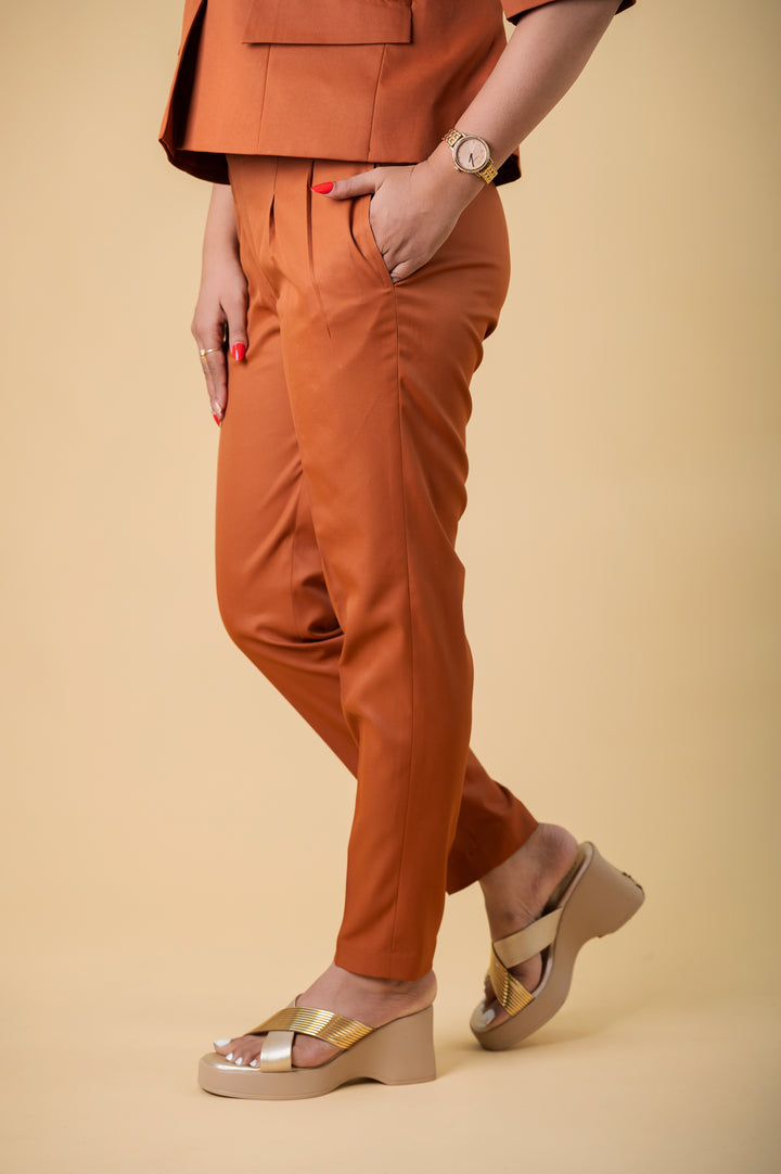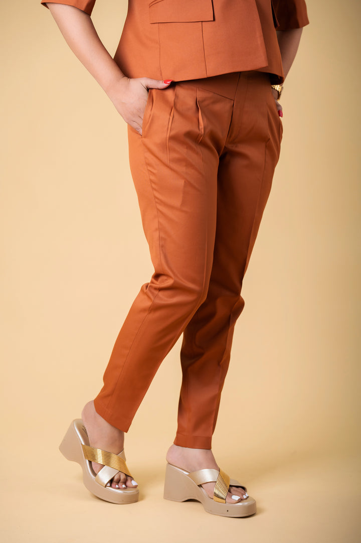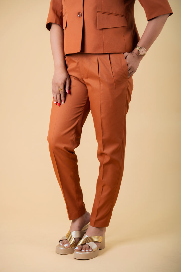 The model wearing rust orange trousers the design feature a front pleat, side pocket, and a waistband with elastic at the back for comfort. the waistband has two buttons for fastening, adding a stylish