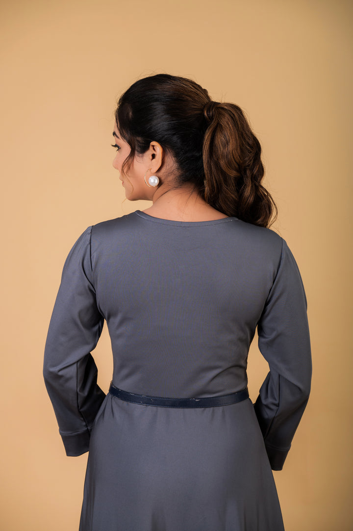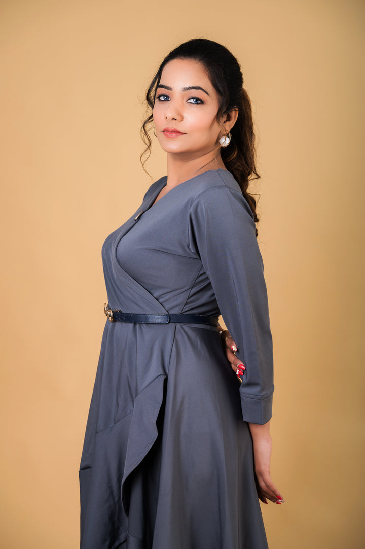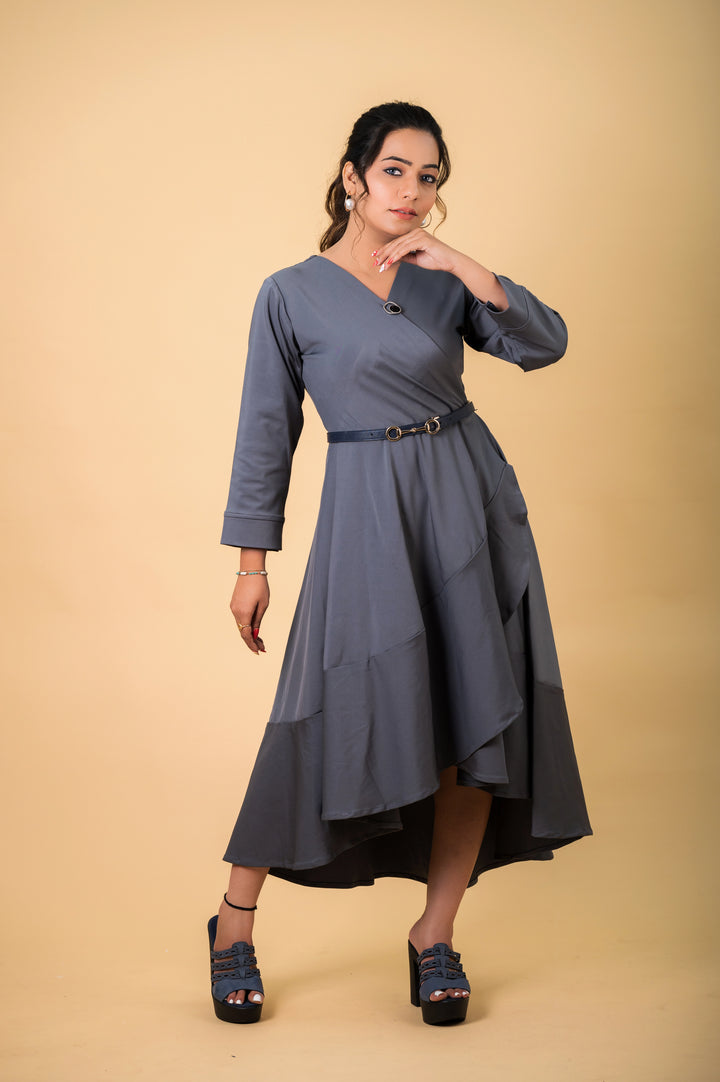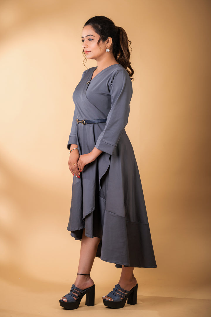 A stylish, asymmetrical grey midi dress featuring a flattering wrap style with long sleeves and a high-low hemline.